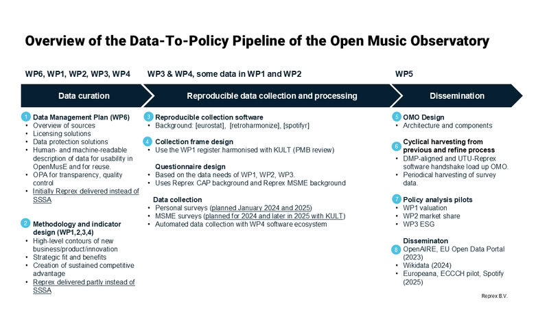 This diagram summarises the intended data-to-policy pipeline of the Open Music Europe project, showing how Work Packages WP1–WP6 were designed to contribute sequentially to the creation of the Open Music Observatory. Beginning with governance and metadata foundations in the Data Management Plan (WP6), the workflow proceeds through indicator design (WP1–WP3), reproducible data-collection software and sampling frameworks (WP4, WP1), survey and automated data acquisition, and the harmonisation and curation of all inputs into analysis-ready datasets (WP4). These curated datasets were intended to feed policy-analysis pilots (WP1–WP3) and be disseminated transparently through the Observatory and European infrastructure platforms (WP5).